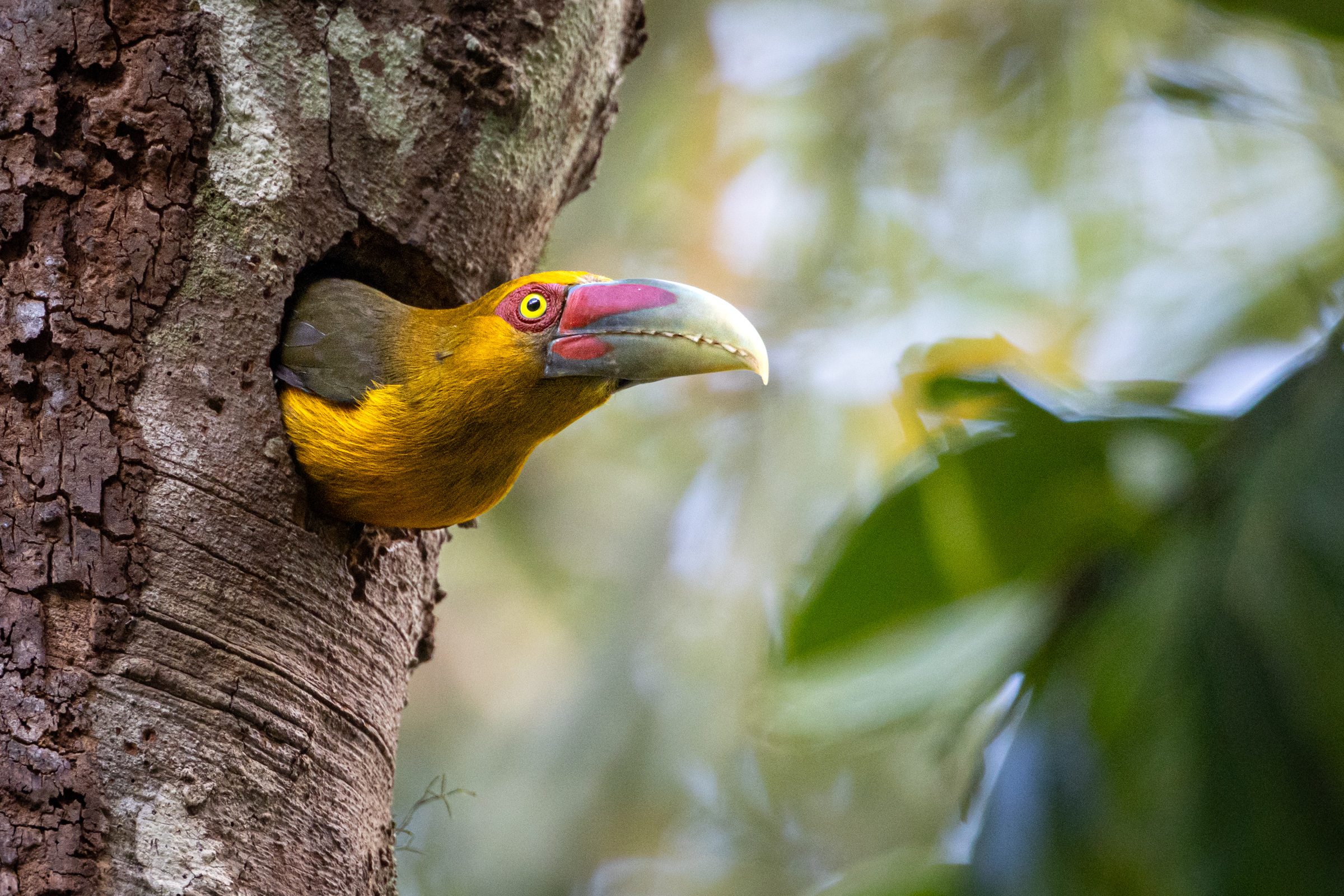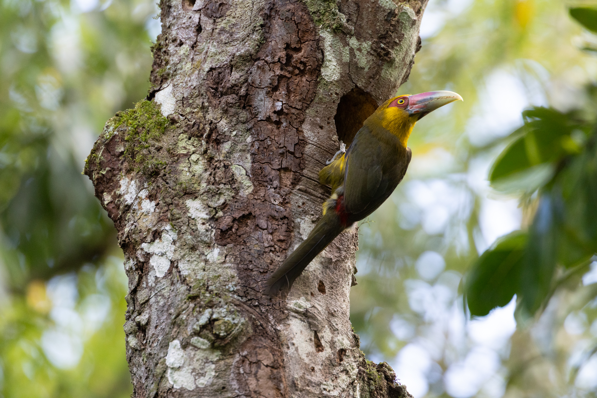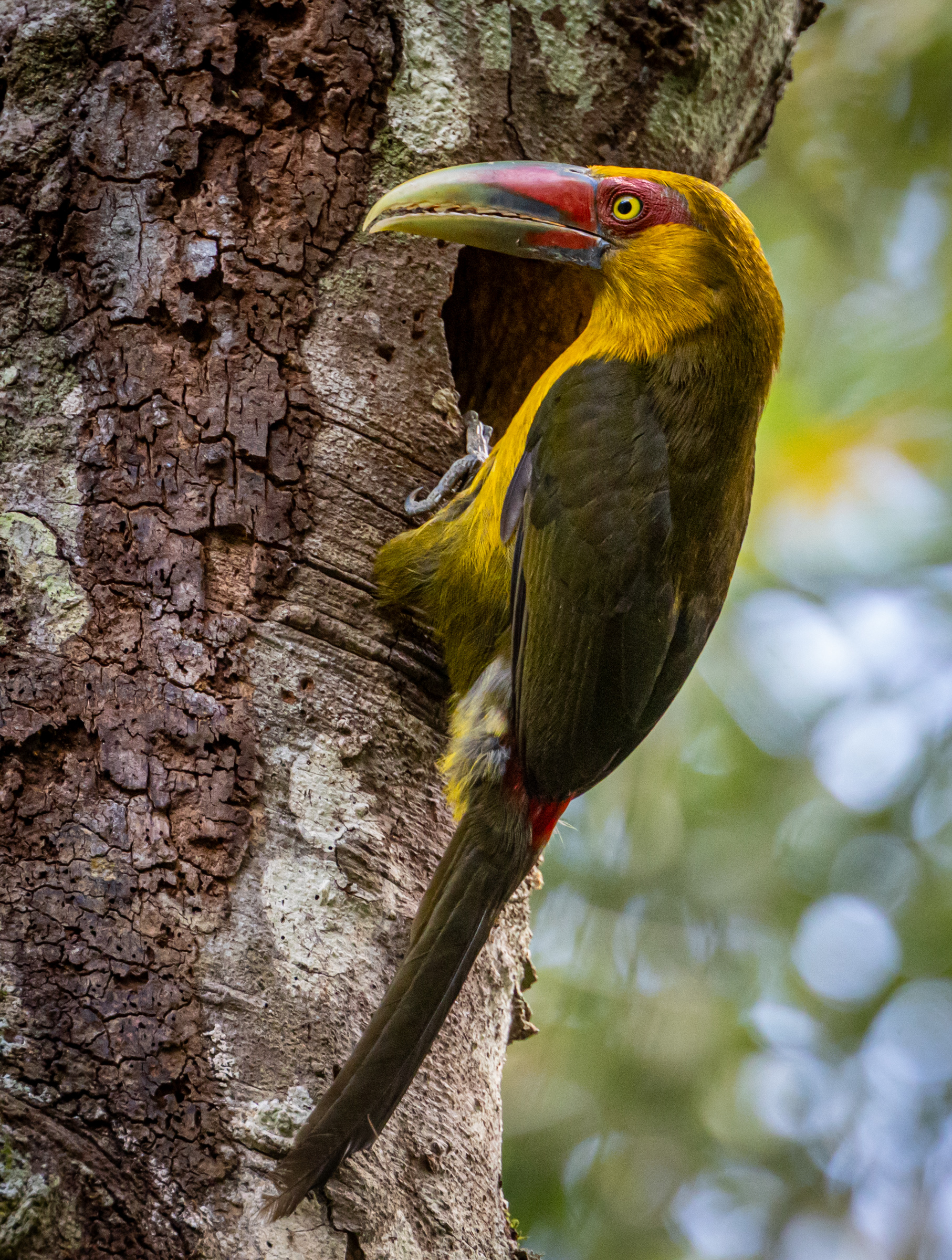 It doesn't have to take hours, either. This next set of a Saffron Toucanet were taken within a moments of one another, as the bird climbed into its nest cavity and then poked it's head out. Perhaps 30 seconds elapsed during the whole series. But I zoomed in and out, and took advantage of the scene as much as I could in the limited time I had.