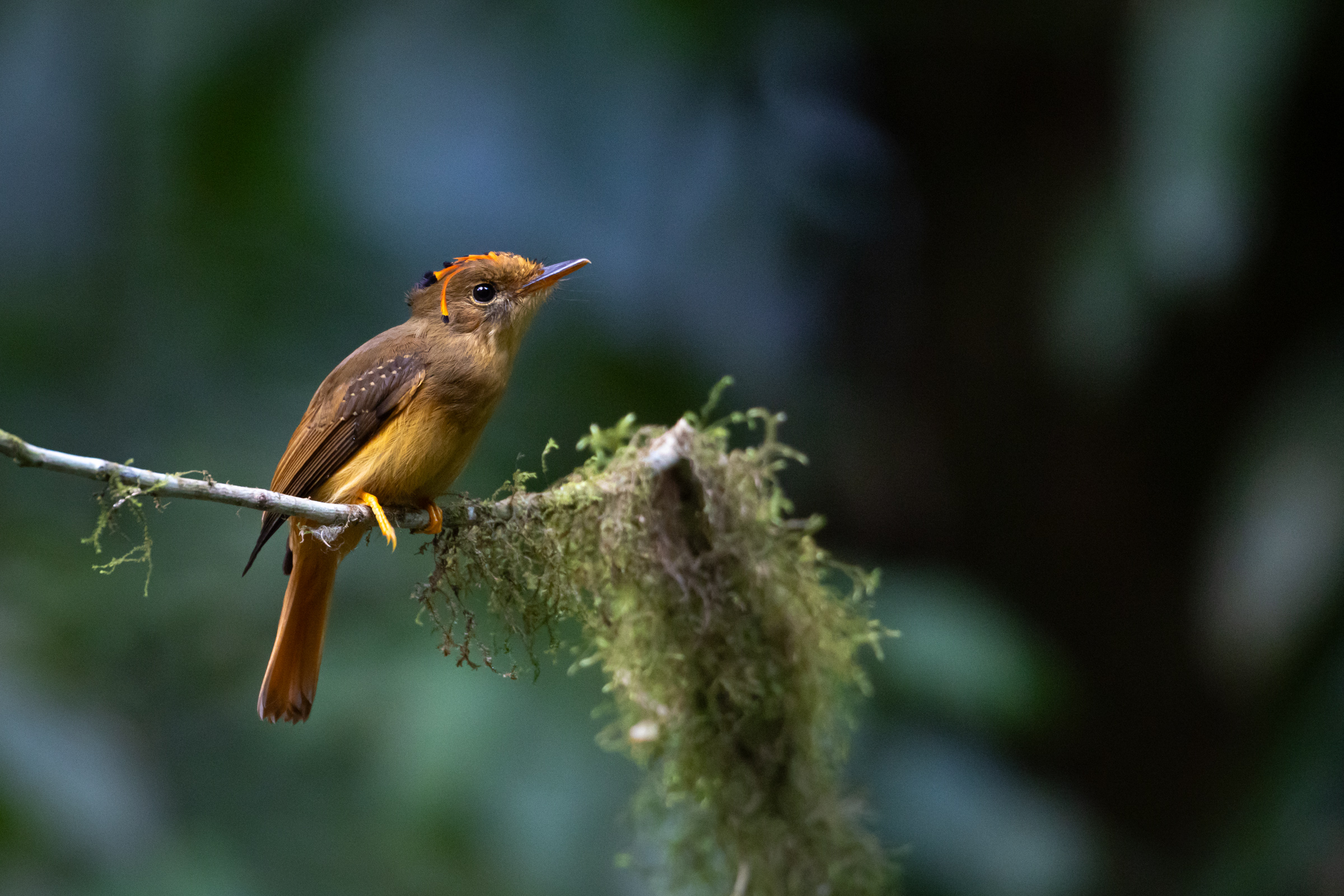 Above, is the classic bird portrait, and in this case, showing a bit of the distinctive crest of the Royal Flycatcher. Clean background, sharp subject. It's a solid photo.